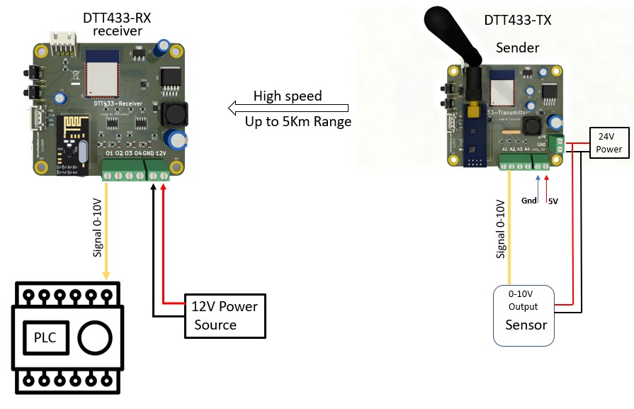 Der DTT433-RF besteht aus zwei Einheiten: einem Sender (DTT433-TX) und einem Empfänger (DTT433-RX). Das System ermöglicht die kabellose Übertragung von bis zu vier analogen 0–10V-Signalen über eine Entfernung von bis zu 5.000 Metern – absolut zuverlässig, störungsarm und mit hoher Präzision.