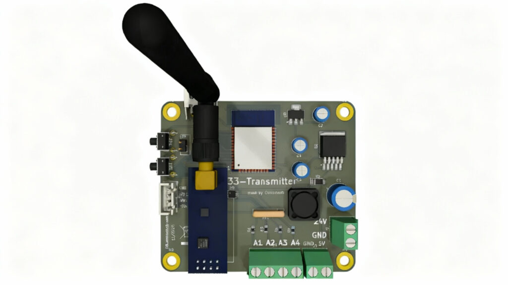 Der DTT433-TX ist ein kompakter, drahtloser Analogsensor-Sender zur Erfassung und Übertragung von bis zu vier Spannungssignalen. Die analogen Eingangswerte werden mit einem hoch­auflösenden 16-Bit-ADC gemessen, digital aufbereitet und über ein nRF24L01+ Funkmodul zuverlässig im 2,4-GHz-Band übertragen.